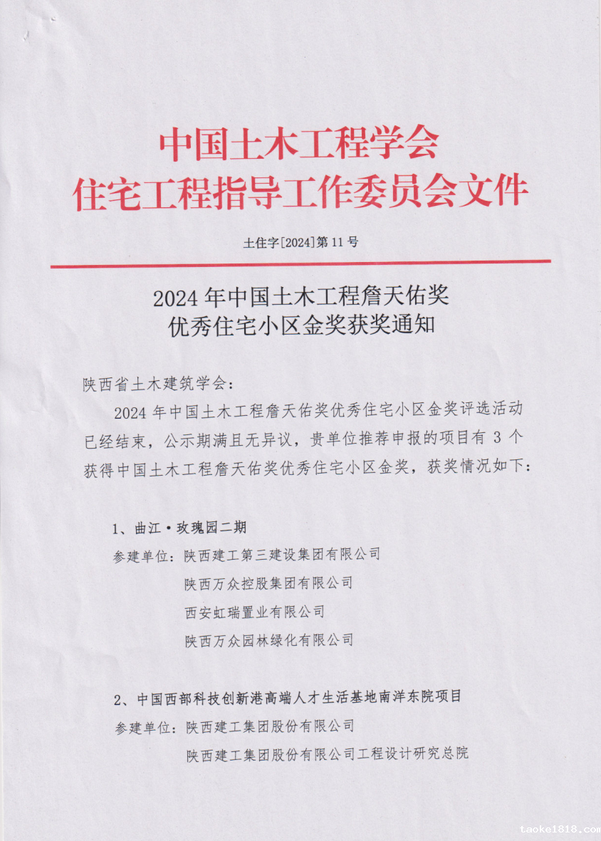 根据中国土木工程学会住宅工程指导工作委员会《2024年中国土木工程詹天佑奖优秀住宅小区金奖获奖通知》(土住字〔2024〕第11号),我会推荐的三个项目:“曲江·玫瑰园二期”、“中国西部科技创新港高端人才生活基地南洋东院项目”、“沣渭壹号院”,荣获“2024年中国土木工程詹天佑奖优秀住宅小区金奖”!在此,我会谨向获奖单位表示热烈祝贺!!