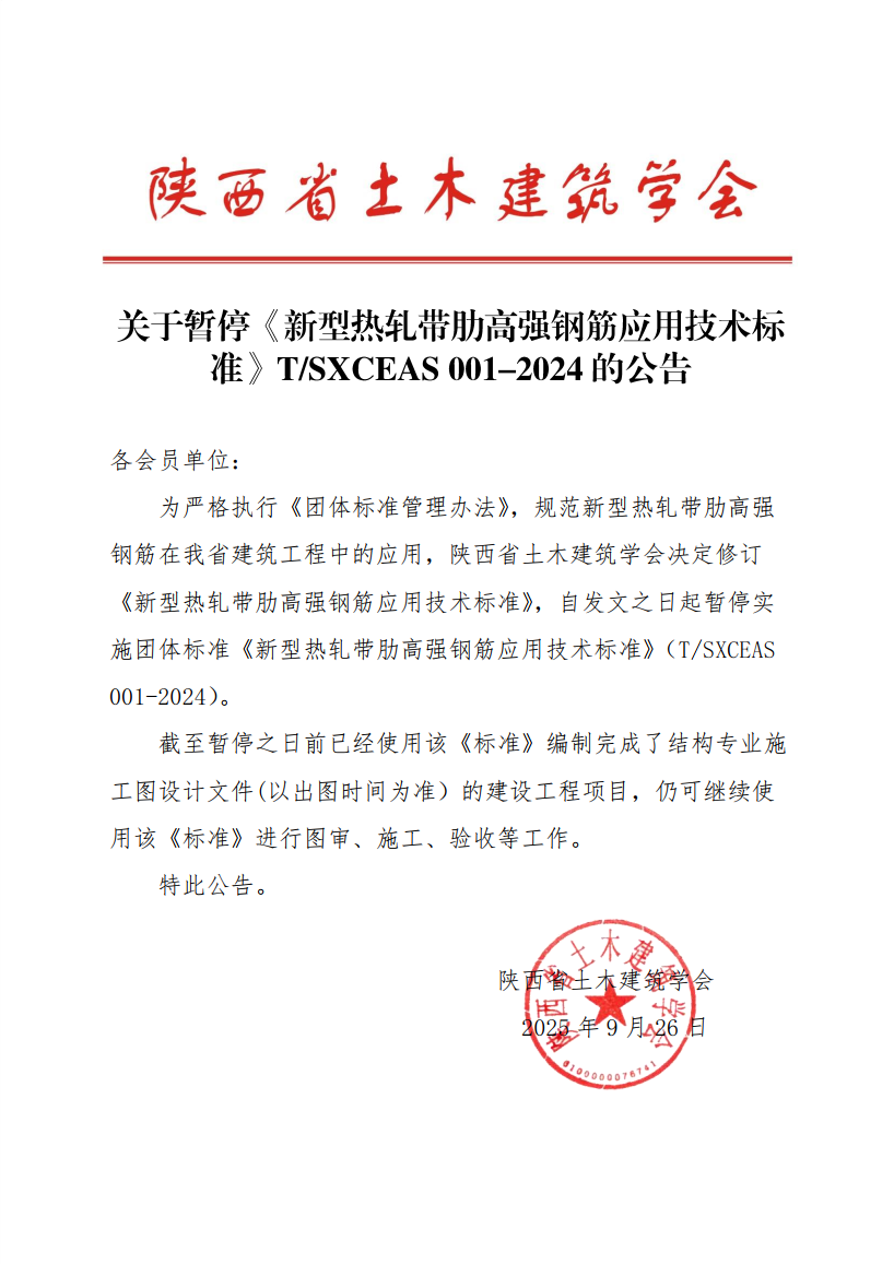 关于暂停《新型热轧带肋高强钢筋应用技术标准》T/SXCEAS 001-2024的公告